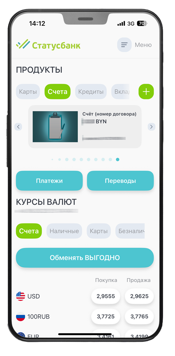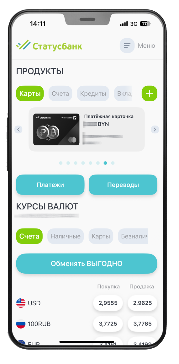 1. Зайти в личный кабинет Интернет-банка СтатусБанка stb24.by либо в мобильное приложение «СтатусБанк 2.0.» под Вашим логином и паролем;