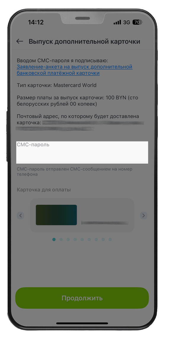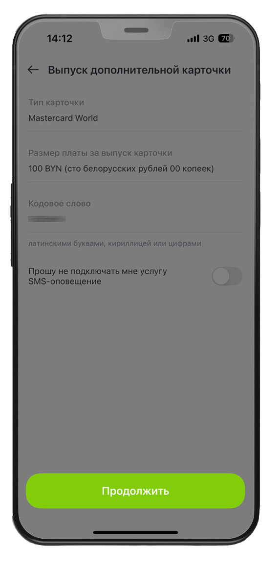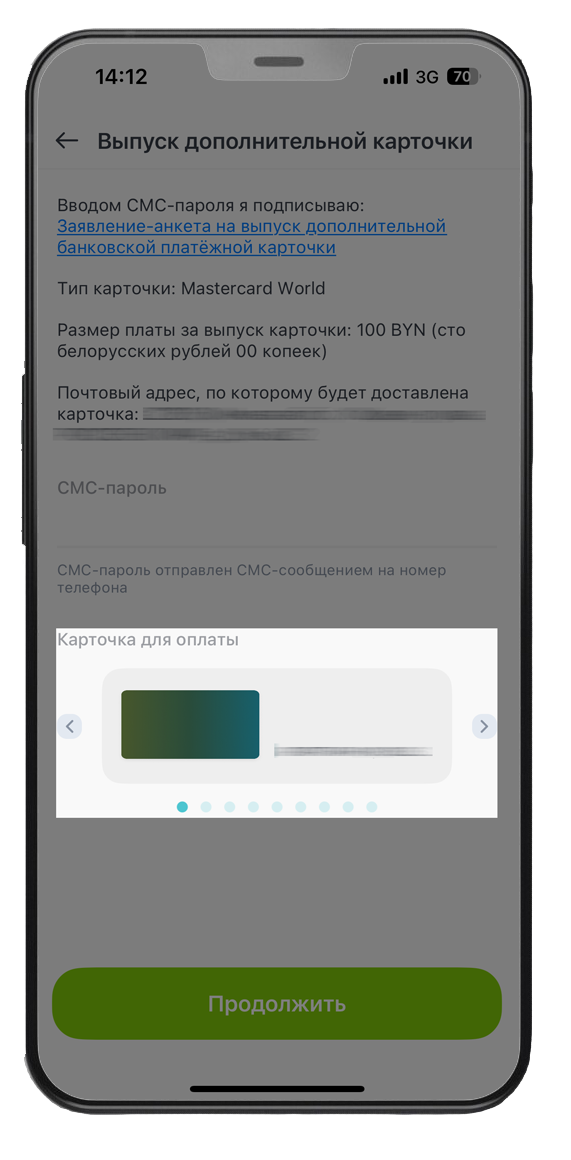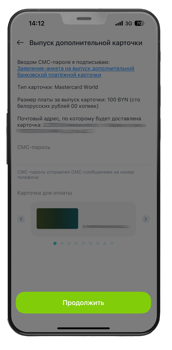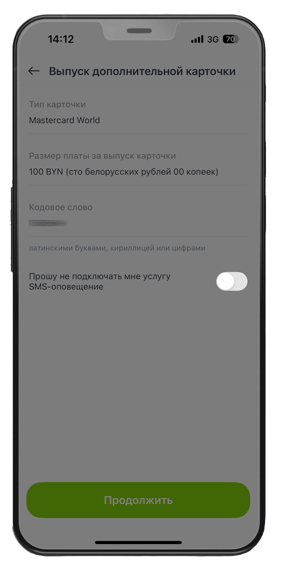 4. Ознакомьтесь со стоимостью (стоимость дополнительной карты 100 BYN). По желанию Вы можете подключить услугу СМС-оповещения → «Продолжить».