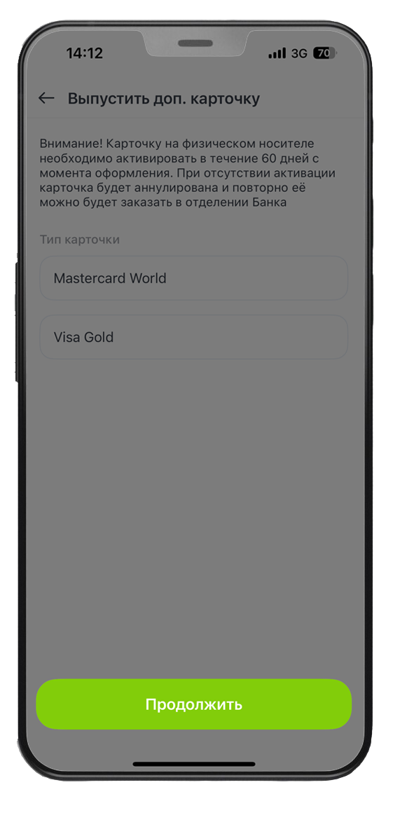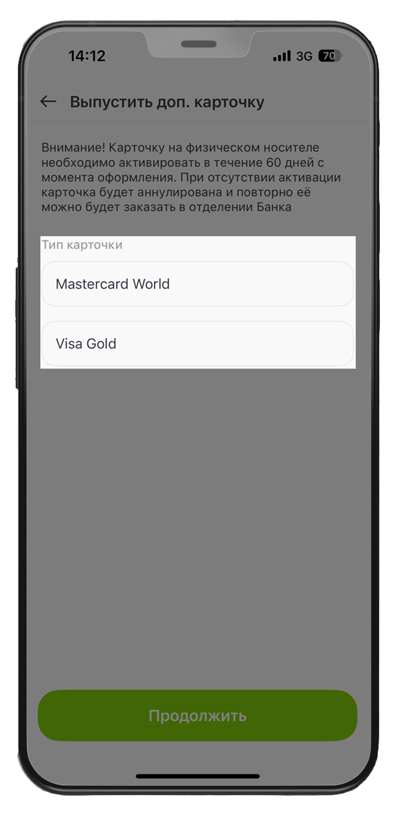 3. Выберите тип карточки Mastercard World или Visa Gold → «Продолжить».
